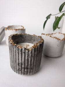 Handmade concrete grey jar with golden stones.